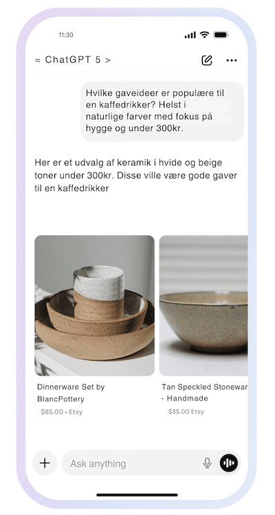 ChatGPT bruges allerede af millioner af mennesker hver uge. Instant Checkout åbner døren for, at dine produkter kan blive en del af denne samtale.